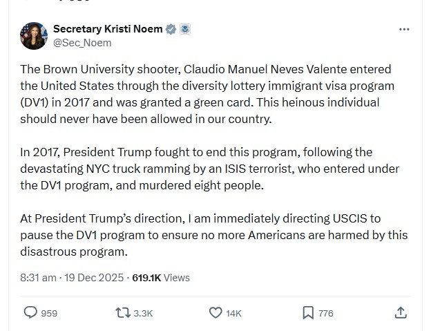 ამერიკის შეერთებული შტატების პრეზიდენტმა დონალდ ტრამპმა „მწვანე ბარათების“ პროგრამის შეჩერების გადაწყვეტილება მიიღო - ამის შესახებ სოციალურ ქსელ X-ზე აშშ-ის საშინაო უსაფრთხოების მდივანმა, კრისტი ნოემმა დაწერა.